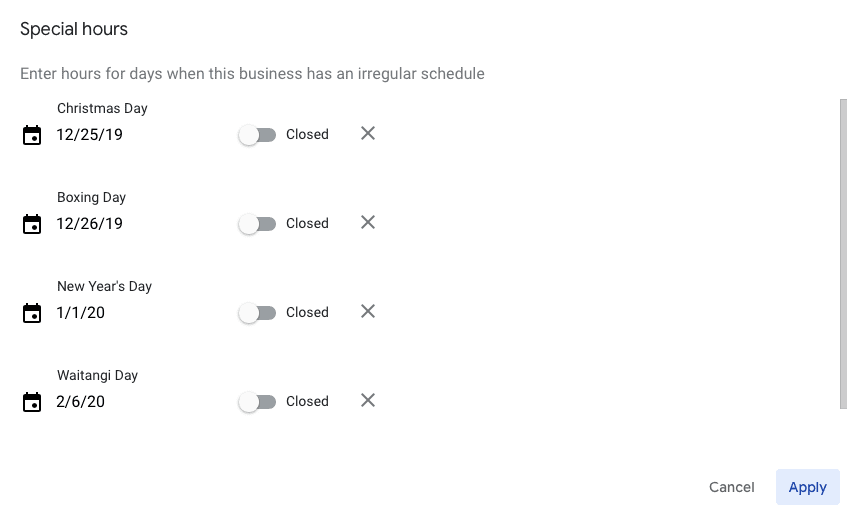 Now you can schedule your Google My Business page to automatically change opening hours for those days only. Even better – Google will indicate to customers that your special hours are holiday hours, so they won’t assume you’re closed every Monday once the Christmas break is done and dusted.