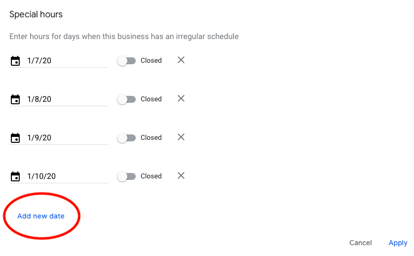 #5 Select the ADD NEW DATE option to add special hours for additional days, then click the APPLY button!